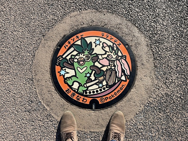 - 筆者の現地レポート:世界遺産「斎場御嶽(せーふぁうたき)」への入り口にも近い「がんじゅう駅・南城」に、少し怖いけどカッコいいハブネークとザングースのポケふたが。自然豊かな南城市の森の中に、今にも動き出しそうな2匹の姿がリアルに描かれています。周辺は海が一望できる絶景の地で、ポケふた巡りをしながら「ニライカナイ橋」「斎場御嶽」といったパワースポットも楽しめます!